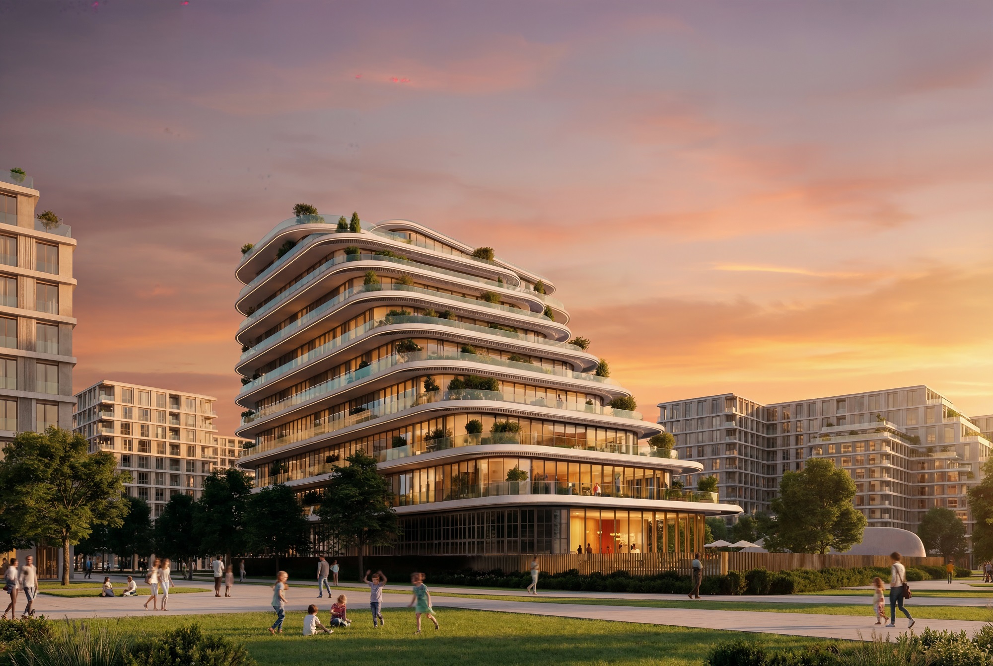 Interiors are designed with an emphasis on functionality, clarity, and warmth. Light-filled living spaces, neutral material palettes, and efficient layouts support modern lifestyles while maintaining a timeless residential character. Amenities including swimming pools for adults and children, a fully-equipped gym, an outdoor cinema, a children’s play area, and dedicated parking with EV charging further reinforce the development’s focus on everyday comfort and quality of life.