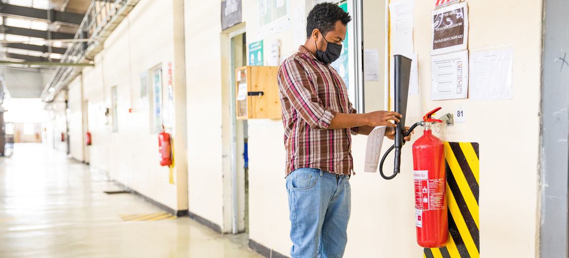 A worker at a factory in Ethiopia carries out an inspection on fire safety equipment.